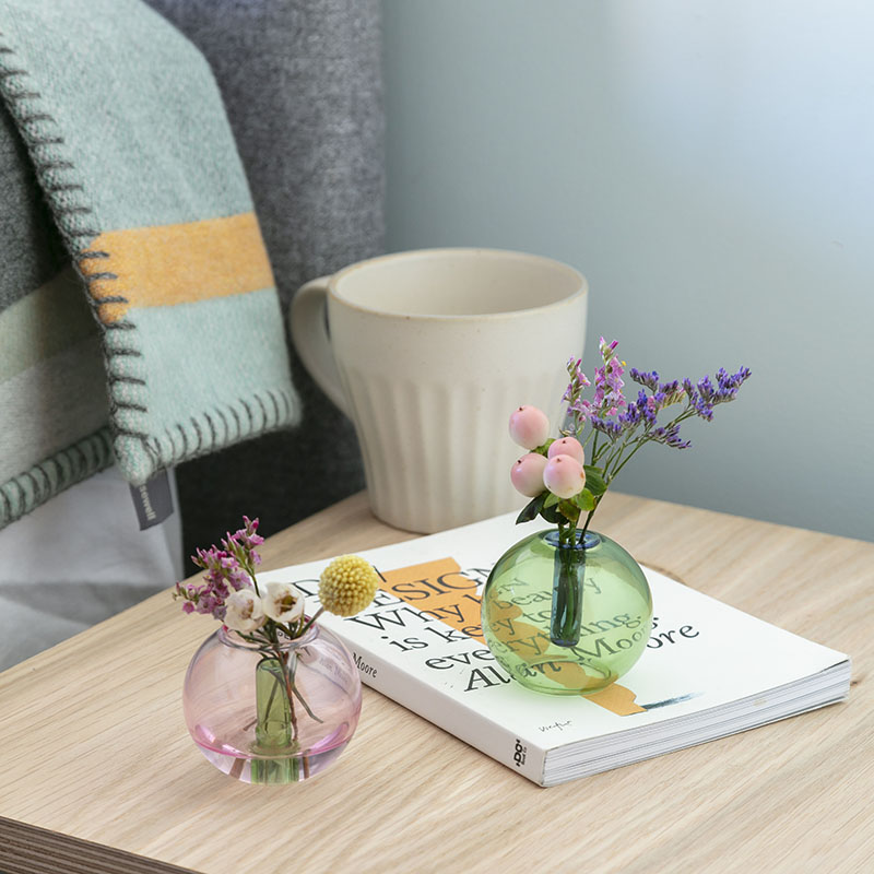 試験管のような細い口を上にすると一輪挿しとして、逆さにするとミニブーケを活けてお楽しみいただけます。