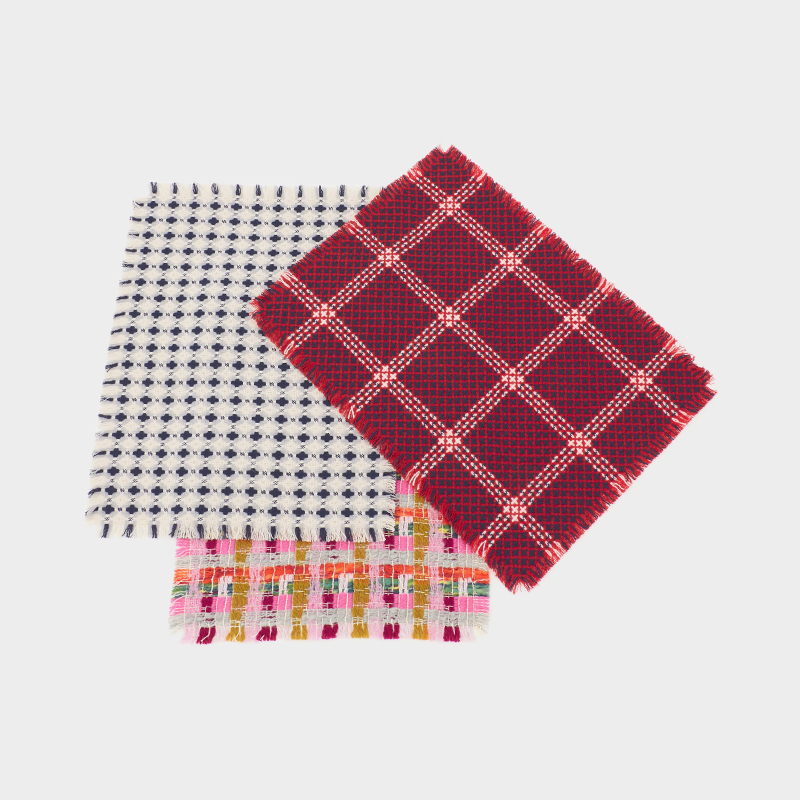 設計図からは計算しつくせない偶然性も、生地がもつ可能性だと考え、できあがった生地は服や暮らしの道具、インテリアなどさまざまなものへと形を変えていきます。Kijinokanoseiのプレイスマット。