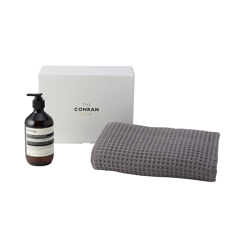単身用からご家族用まで幅広くお使いいただけるギフトセットです。AESOPのボディークレンザーと吸水性と肌触りが魅力なワッフル生地のバスタオルのセット。