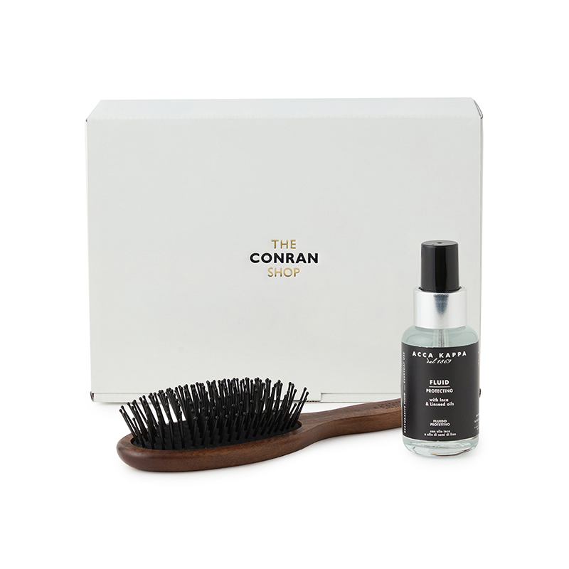 イタリアのヘアケアブランド、davines(ダヴィネス)のヘアオイルと、ACCA KAPPA(アッカ・カッパ)のヘアブラシのセット。