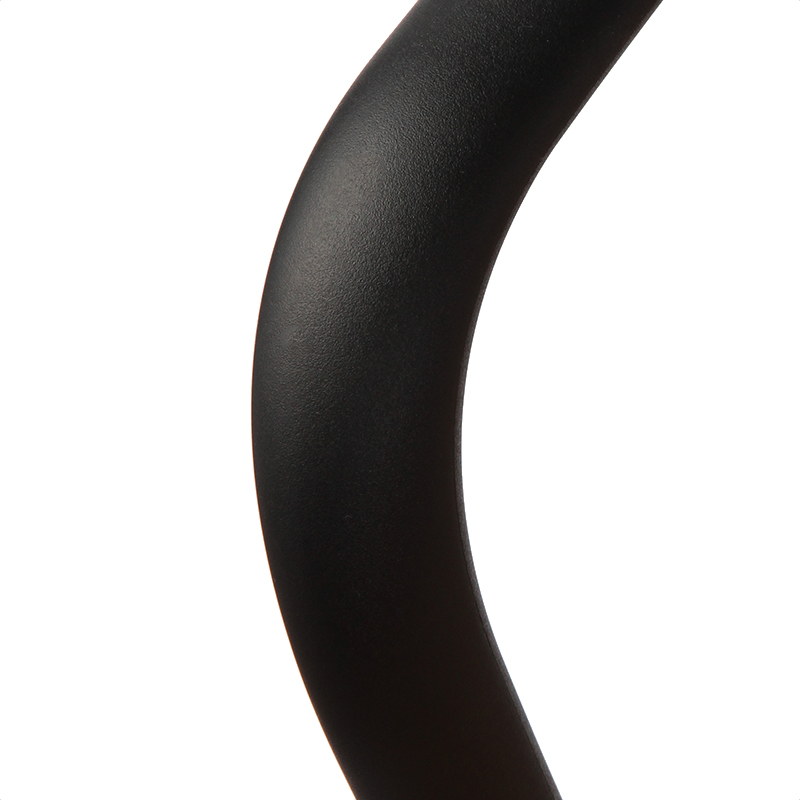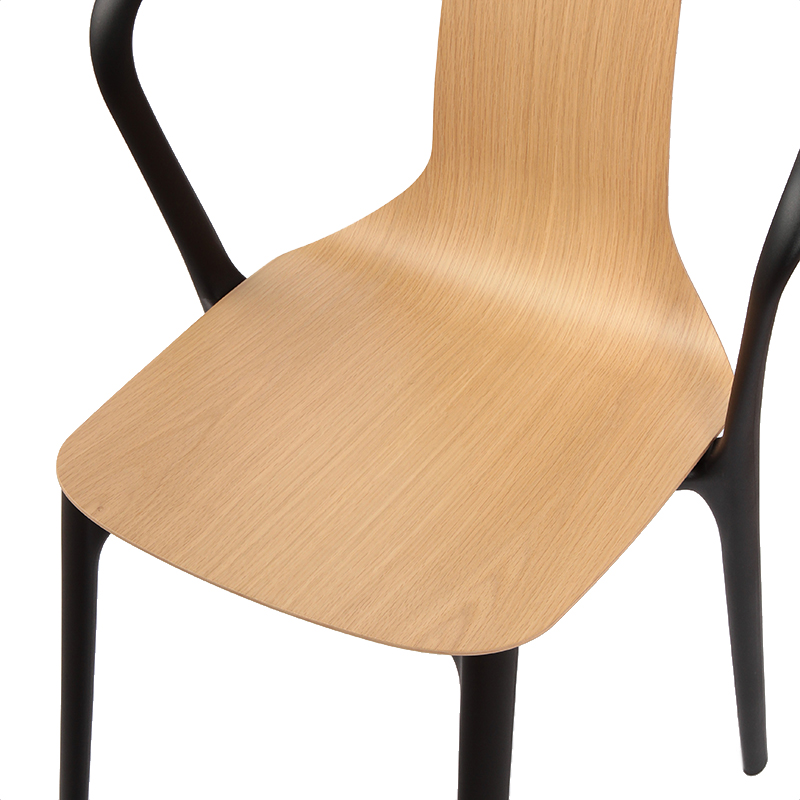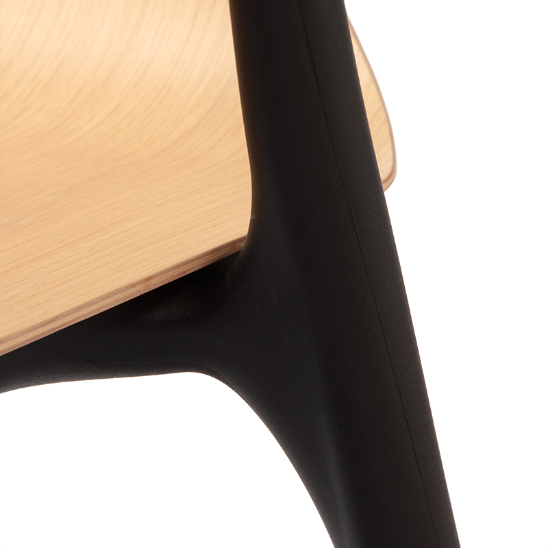 スレンダーな黒のフレームは、脚や背面に向かって書道の線を思わせるようなラインを描いています。一方シートシェルは、広めの座面が背もたれにかけて細くなっていき、非常に薄いシェルを支えています。