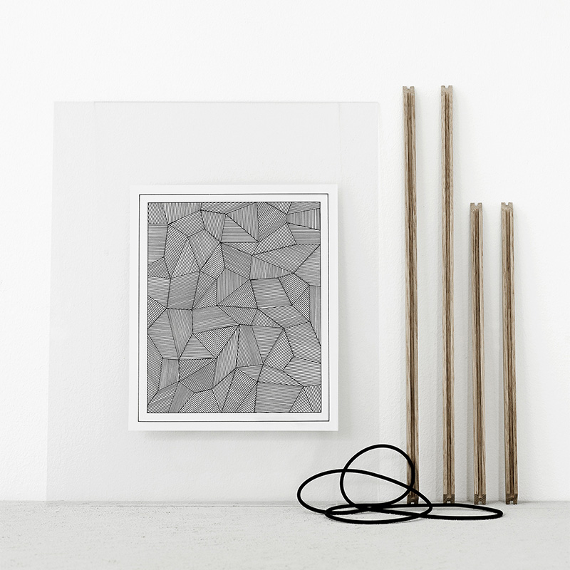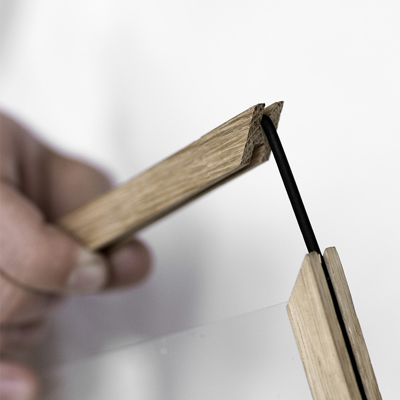 「良いデザインとは、それ自体がサステナブル(持続可能なもの)である」という信条のもと、簡単にリペア、組立、リサイクルできるパーツで構成されています。アクリル板と枠材をラバーバンドで固定するだけの「FRAME(フレーム)」、くさびで棚板を固定するシンプルな構造の「シェルビングシステム」など、緻密な構造とミニマリズムを追求したプロダクトは発表されるや否やすぐに世界的な人気を博しています。普遍の形ともいえる“ 額縁 ”をこれまでにない観点から捉え直しデザインされたフレーム。