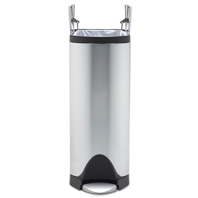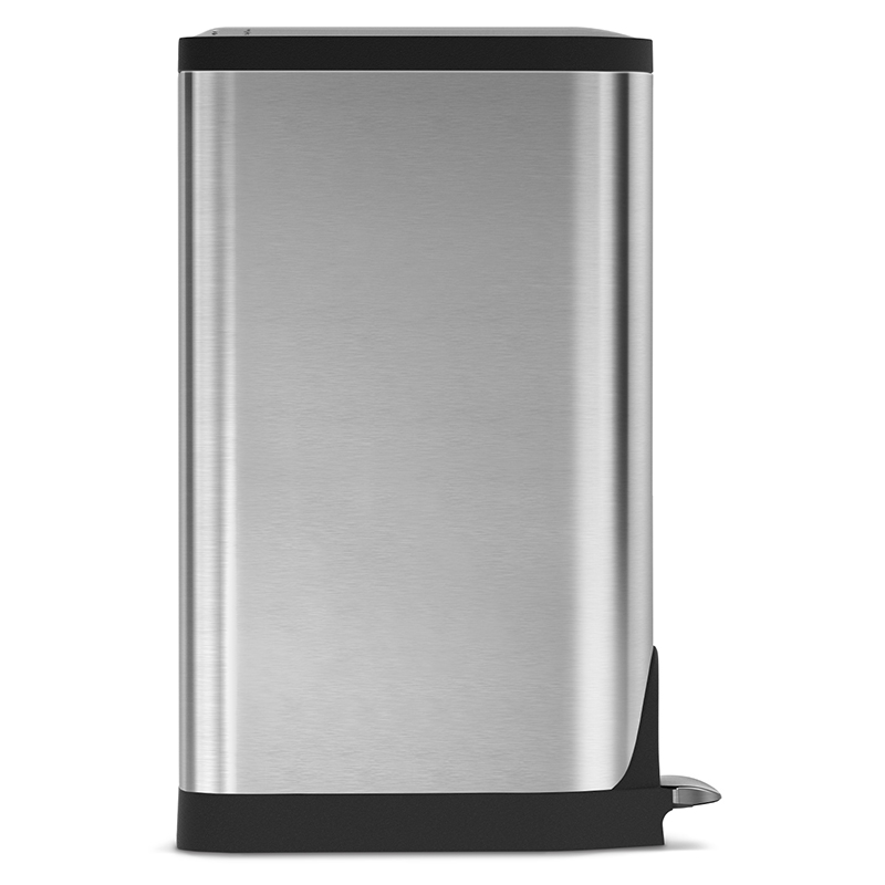 フタが中央から分かれて開くため、開けた状態の高さが低く抑えられます。エアーダンパーによりフタがゆっくり閉まるので音も静かです。ロック機能でフタが開いたままの状態になり、ゴミ袋を交換するときなどに便利です。【simplehuman】