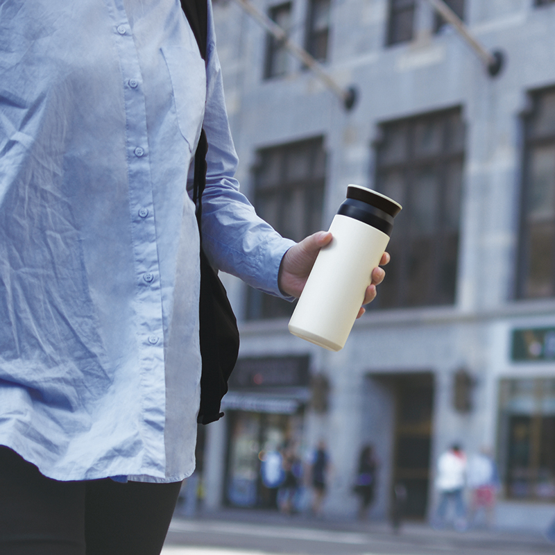 コンパクトなフォルムで車や自転車のドリンクホルダーに納まり、密閉できるので持ち運びに便利です。