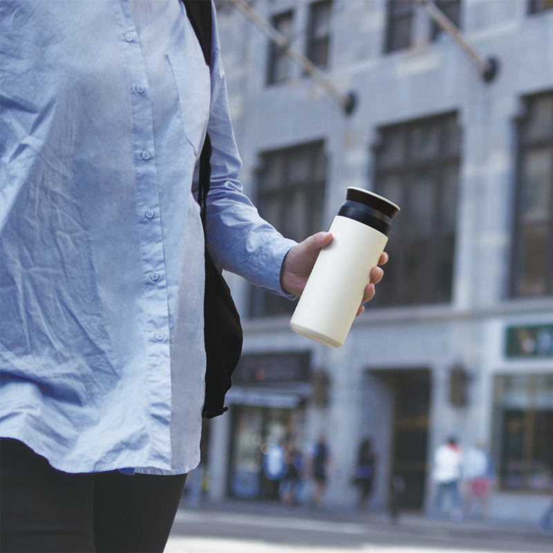 コンパクトなフォルムで車や自転車のドリンクホルダーに納まり、密閉できるので持ち運びに便利です。