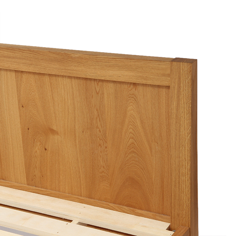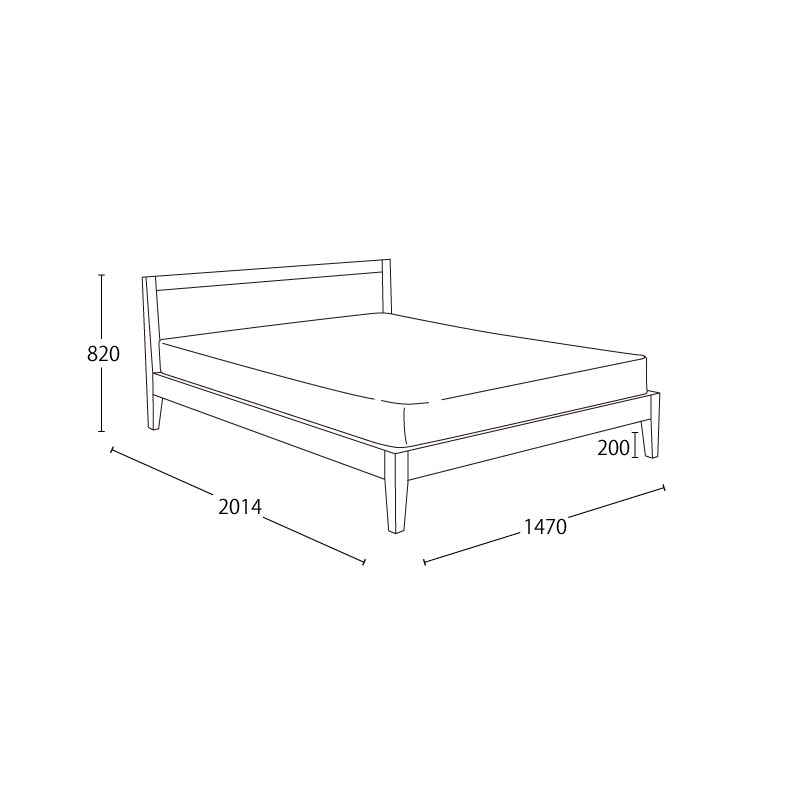 無垢材のフレームと突板をランダムにはめこんだヘッドボードが、シンプルななかにも動きのある表情をみせるベッド。