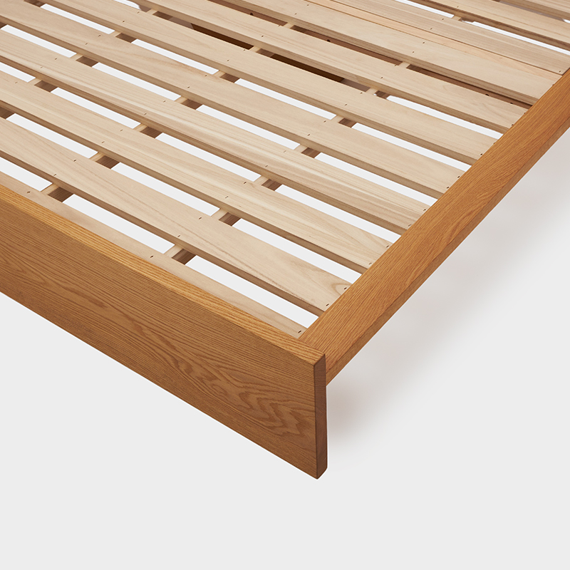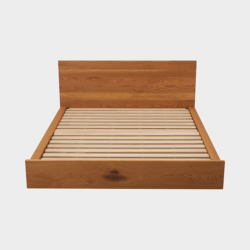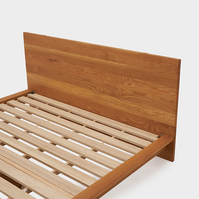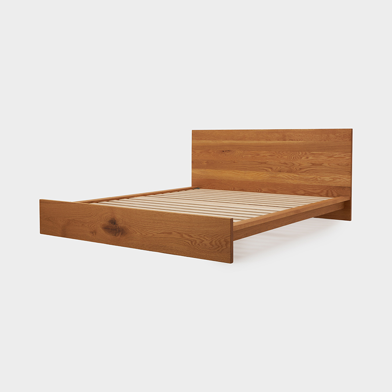 オーク の無垢材を無作為に剥ぎ合わせ、ヘッドボード、 フットボード をそれぞれ一枚の“表情豊 かなPLATE(板)”として加工した、ザ・コンランショップオリジナルのベッドです。