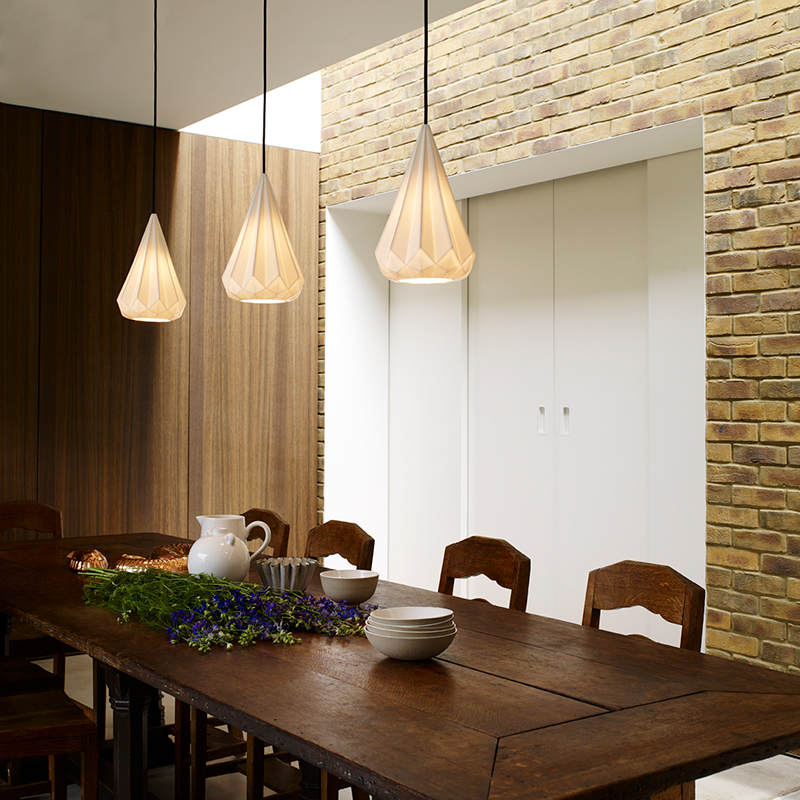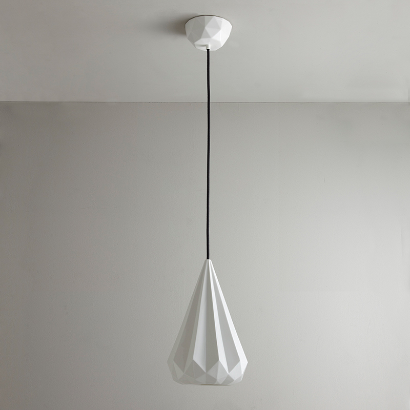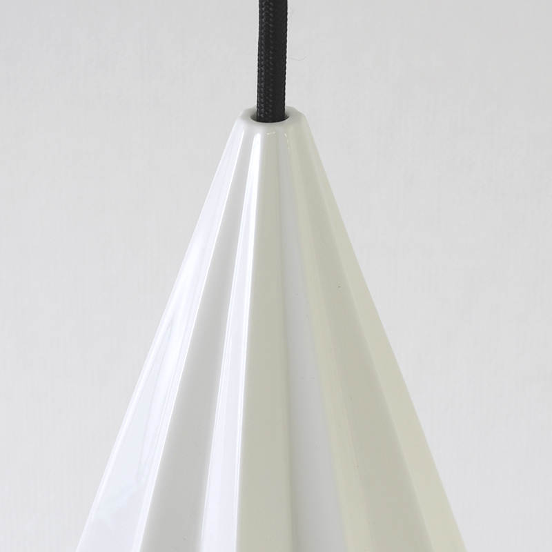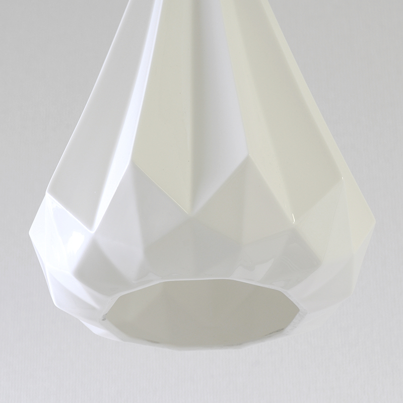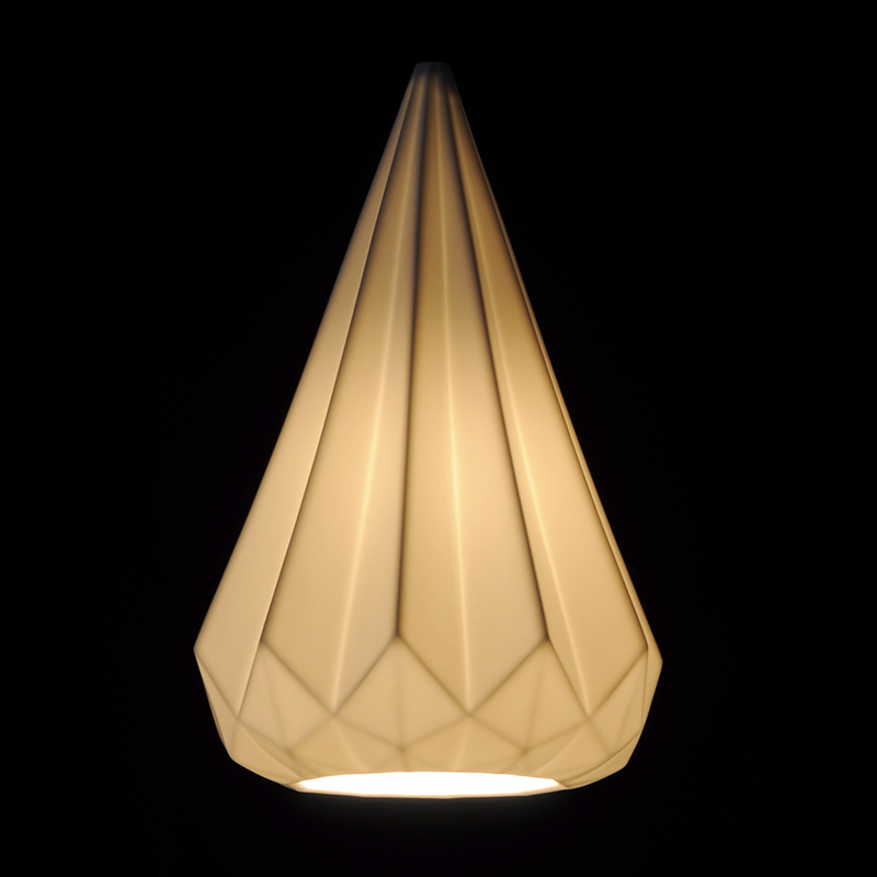 18世紀より続くイギリス伝統の陶磁器の一種ボーンチャイナで作られた乳白色のシェードは、一般的な陶磁器と比べ透過性が高く、起伏のある様々な角度の面で光の陰影を楽しめます。点灯時はもちろん、消灯時もまるで彫刻作品のように空間を演出してくれます。
