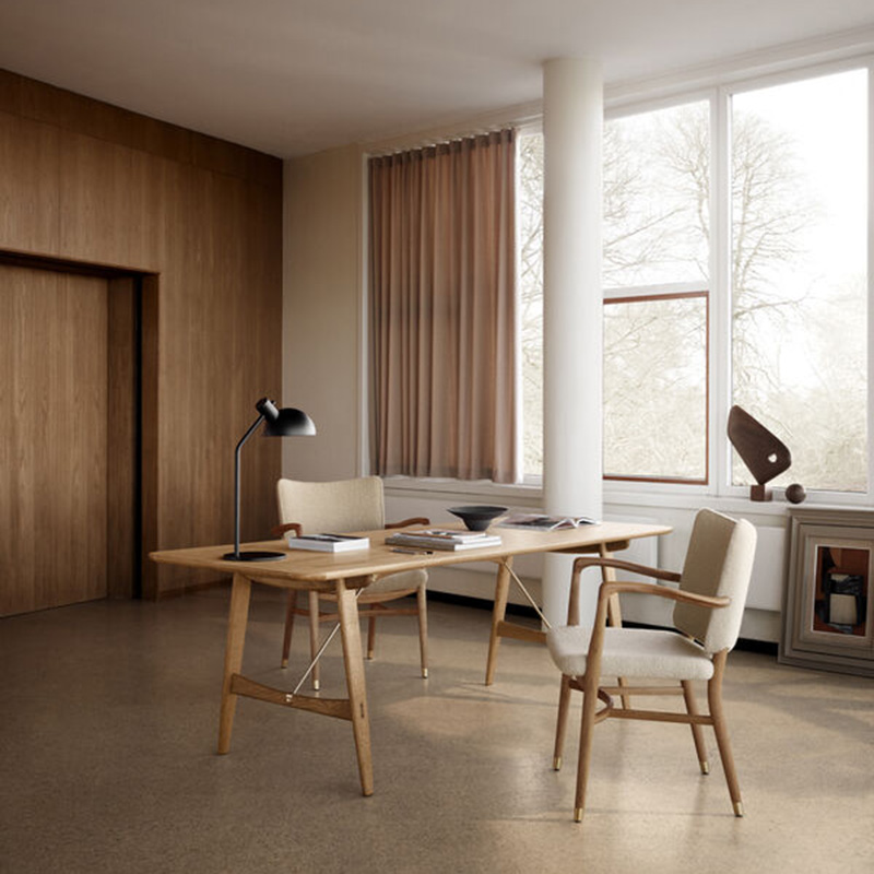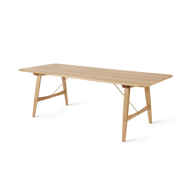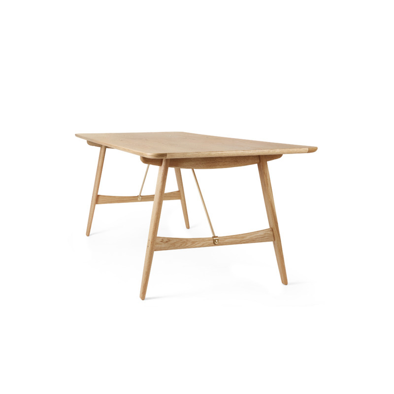 真鍮製の2本の支柱がテーブルに安定性を与え、天板と脚部を優雅に、そして印象的に接合するよう考慮されたデザインです。職人技が映える、ほぞ継ぎやコントラストをつけた木製のくさびなど、脚部の美しさが、テーブルの優雅さを強調しています。