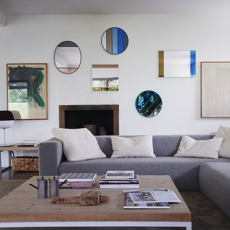 Vitrail には、4 つの形があり、壁に水平に掛けることも垂直に掛けることもできます。小さな正方形、大きな長方形、オーバルの形のタイプは、中央に大きなクリアミラーが配されていて、両サイドの2色のカラーミラーに挟まれています。いずれも平行するラインが強調されています。