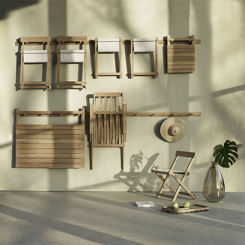全商品折りたたむことができ、使用しない時には、専用の壁掛けフックで壁にかけ、壁のアートピースのひとつとして収納することを念頭に置いたデザインです。