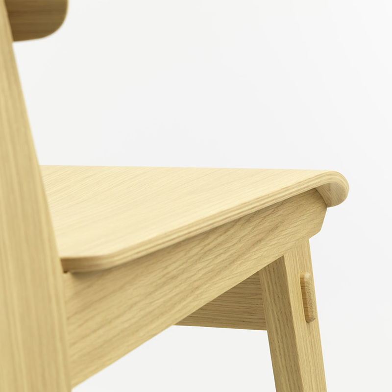 フランス語で"オールウッドチェア"という意味の通り、パーツの接合に部品を一切使わず、木材のみで作られています。建築家らしい極めて合理的な考え方に基づいて造られたこの椅子は、最大の負荷重量がかかる後部フレームと座面が結合する点を、後脚を兼ねた頑丈なフレームで補強することにより、全体への荷重を支えています。