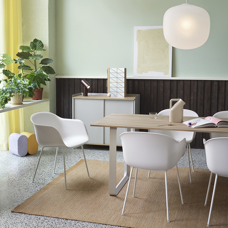 Fiber Armchairのシェルは、プラスチックと木の繊維を混ぜた革新的な複合材で作られており、ソフトで魅力的な肌触りです。