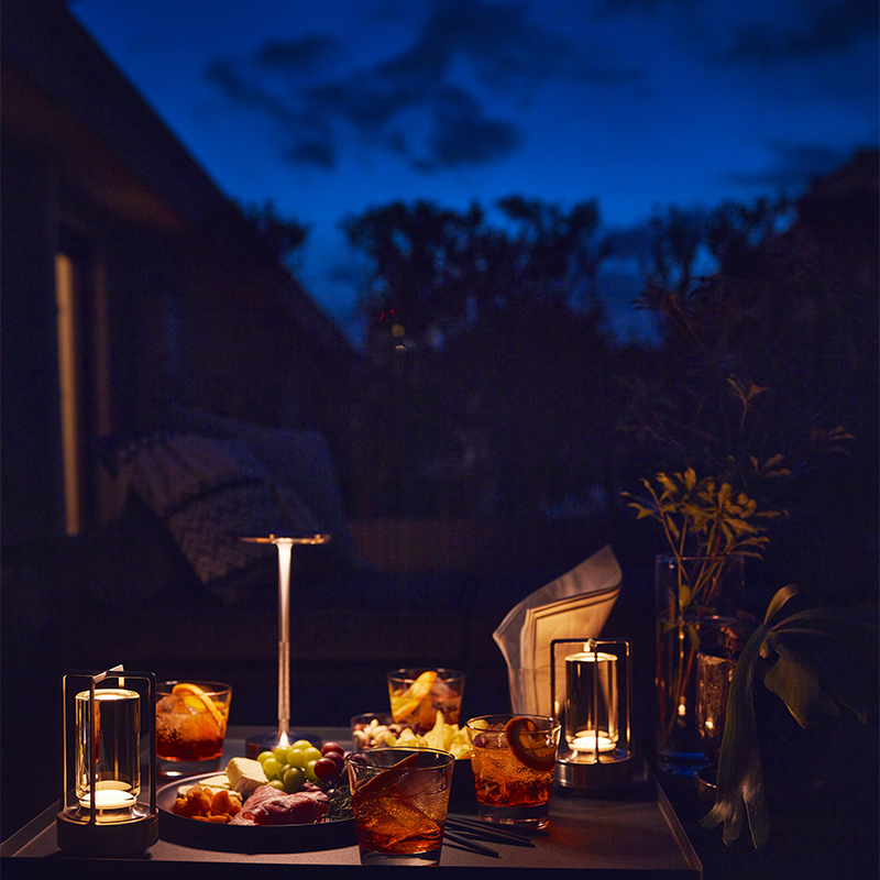 ランタンの優しいフォルムと自然光にインスパイアされたTURN+ は、新開発のLEDによって、明るさだけでなくオレンジ色の濃厚な暖色から温かみのある電球色へと、光色も4段階に変化します。