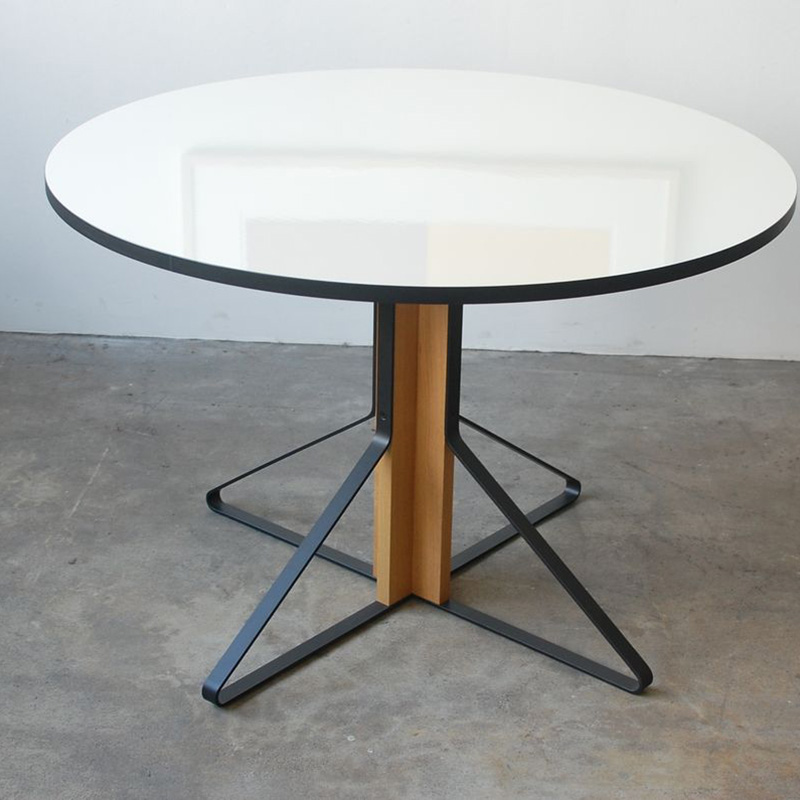 ”縦方向”の支えとなる頑丈な木製部分と、”斜め方向”の支えとなるスチール部分。異なる素材の組み合わせが特徴的なテーブルは、耐久性はもちろんのこと、全体のデザインにリズムをもたらし、独自のシルエットを形作っています。