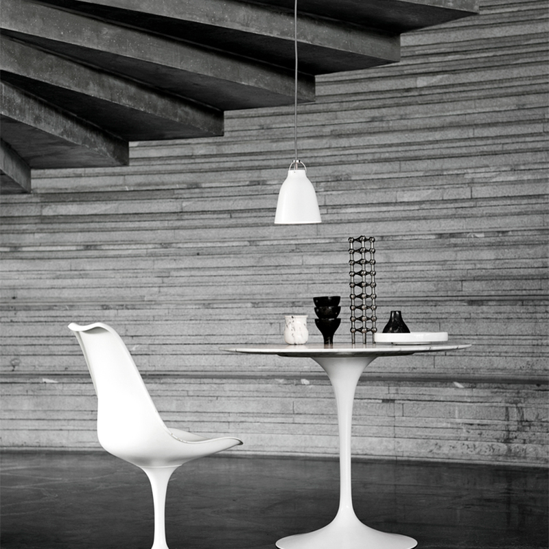 シンプルでタイムレスなペンダントは、ソフトでフェミニンな輪郭のスチール製シェードと、クロームメッキ仕上げのアルミニウム製のアームで構成されています。テキスタイルのケーブルは、デザイン中で重要な要素となっています。