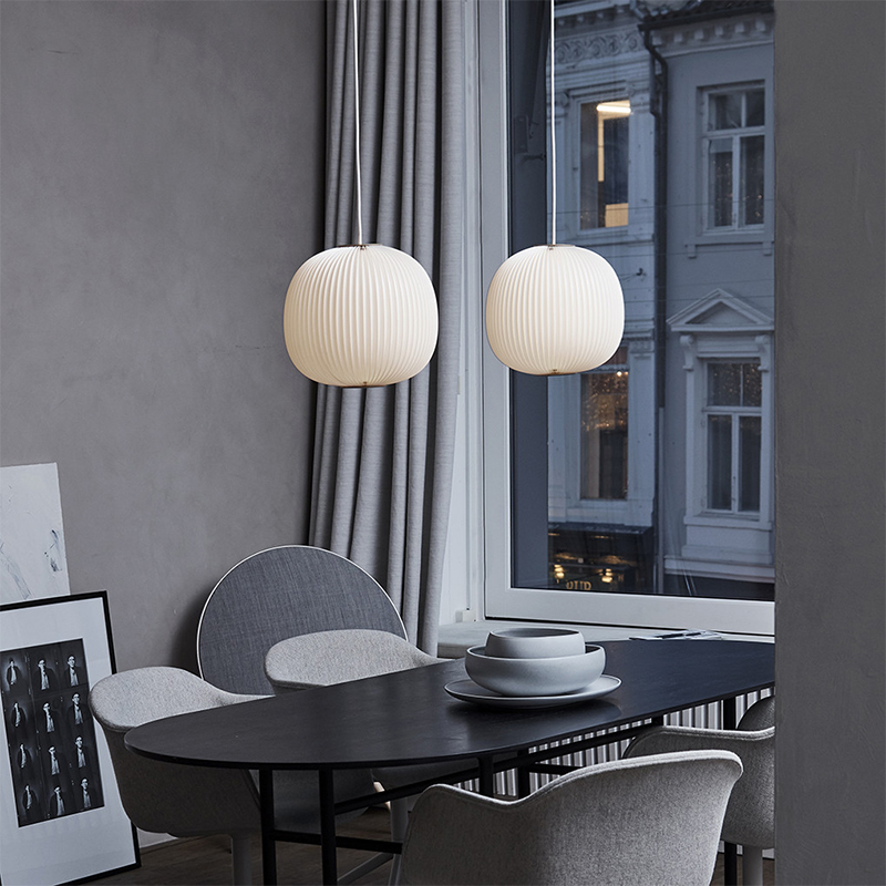 1枚の樹脂製シートから無数のプリーツを折り上げ、頂点を作らずに熱で湾曲させる技術は習得が非常に難しいとされています。角のない流れる様な有機的なフォルムにより、シンプルで美しく、そして軽やかな印象の照明に仕上がりました。