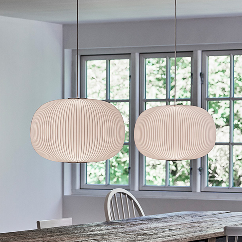 1枚の樹脂製シートから無数のプリーツを折り上げ、頂点を作らずに熱で湾曲させる技術は習得が非常に難しいとされています。角のない流れる様な有機的なフォルムにより、シンプルで美しく、そして軽やかな印象の照明に仕上がりました。