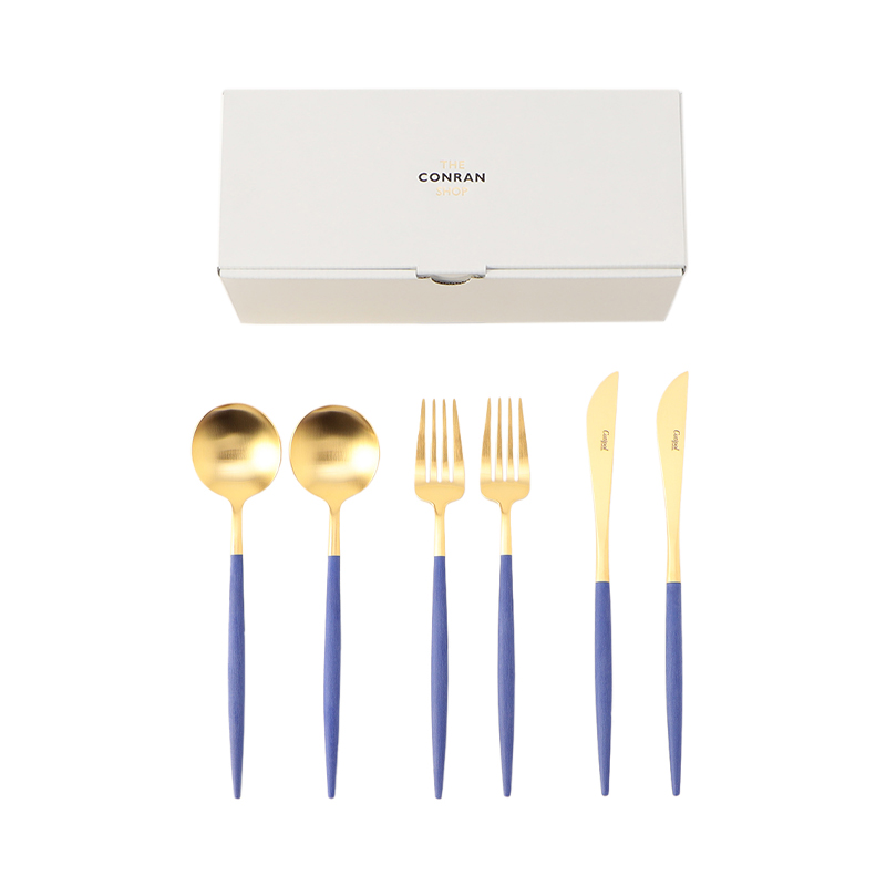 マットゴールドに持ち手をブランドカラーのコンランブルーで仕上げたカトラリーは、上品かつモダンな雰囲気が、カジュアルミールからスペシャルディナーまで、食卓をスタイリッシュに彩ります。