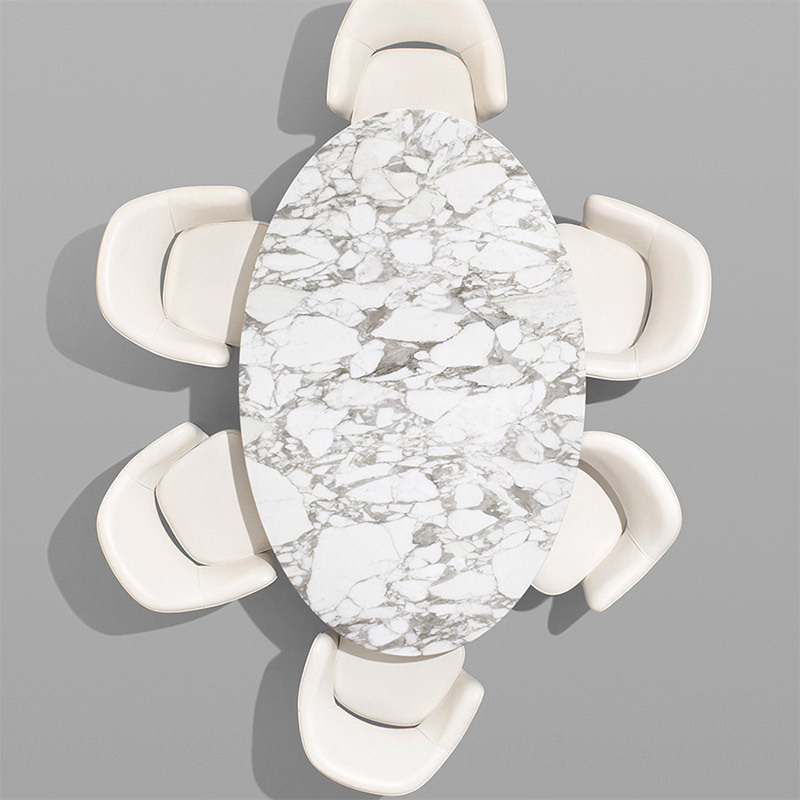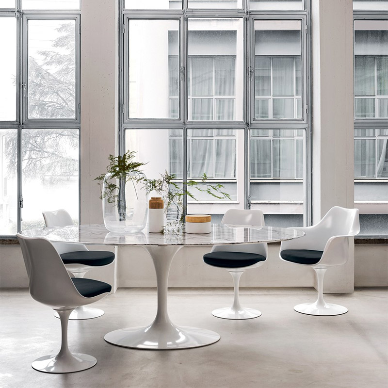 天然の大理石の為、ひとつひとつ斑の入り方が異なり、模様に個体差がございます。 ご理解いただき、ご購入いただきますようお願いいたします。建築や家具のデザインを数多く手がけたデザイナー、Eero Saarinen(エーロ・サーリネン)によるデザインのSAARINEN TABLE(サーリネンテーブル)。1950年代のアメリカデザイン黄金期にTULIP CHAIR(チューリップチェア)と共に生まれたことから、別名チューリップテーブルとも呼ばれています。ミッドセンチュリーを代表する家具のひとつです。天板の大理石は、自然な柄を活かしながら日常使いに対応できるよう防汚コーティングが施されています。
