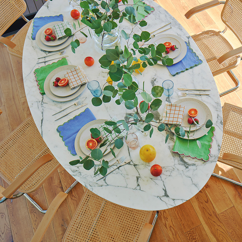 建築や家具のデザインを数多く手がけたデザイナー、Eero Saarinen(エーロ・サーリネン)によるデザインのSAARINEN TABLE(サーリネンテーブル)。1950年代のアメリカデザイン黄金期にTULIP CHAIR(チューリップチェア)と共に生まれたことから、別名チューリップテーブルとも呼ばれています。ミッドセンチュリーを代表する家具のひとつです。天板の大理石は、自然な柄を活かしながら日常使いに対応できるよう防汚コーティングが施されています。