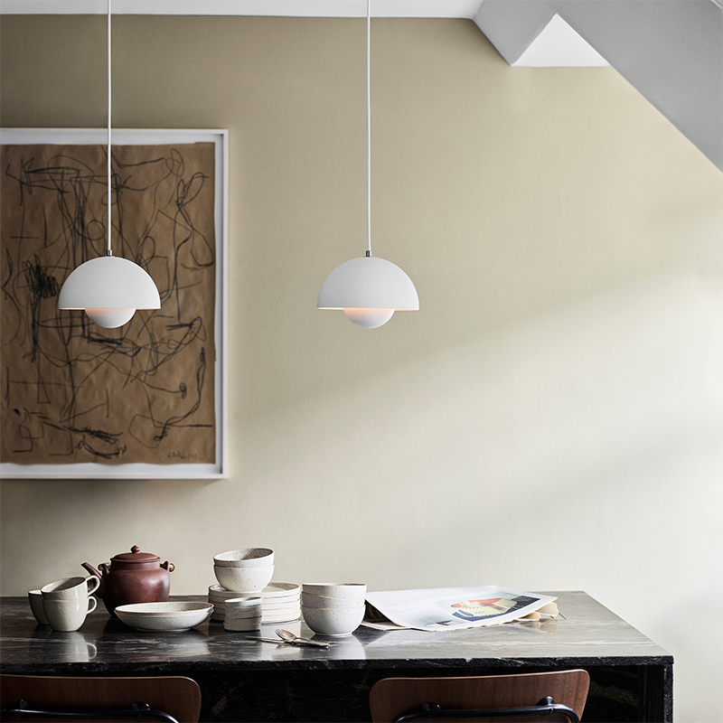 ミッドセンチュリーの代表的なデザイナーVerner Panton(バーナー・パントン)が1968年にデザインした「フラワーポット」シリーズ。60年代の平和運動”フラワーパワー”の象徴的な存在ともなった照明です。二つの半球を組み合わせ、球体内で光が反射し外に柔らかい光が広がる構造のフラワーポットは、現在でもモダンデザインの代名詞ともなっています。VP1は、ペンダントシリーズの中で最もコンパクトな直径230mmの大きさで、多灯吊りにもおすすめです。