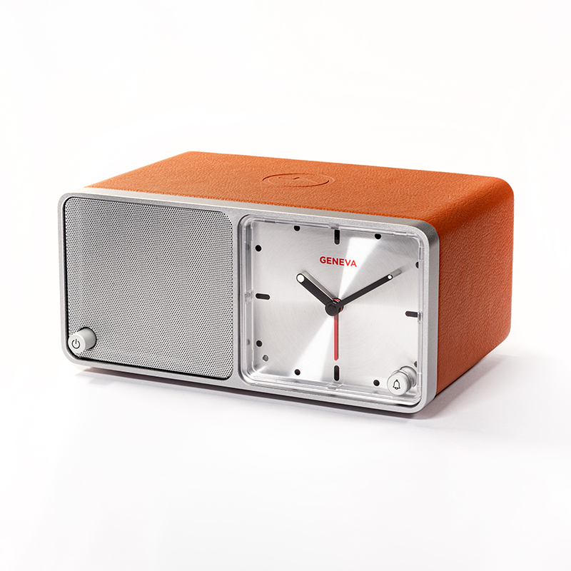 アナログクロックとスマートフォンのワイヤレスチャージ機能を装備したBluetoothスピーカー。