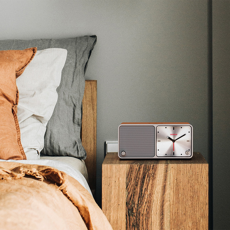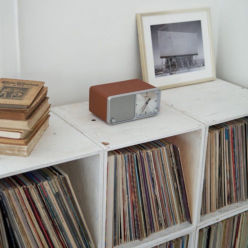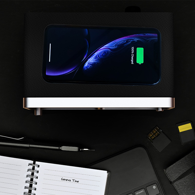 エコレザーに包まれたボディの中には、フルレンジスピーカーとパッシブラジエーターを内蔵。ベッドサイドやデスク等で時を刻むアナログクロックは、直感的に操作可能なアラーム機能を備える一方、お持ちのスマートフォンを載せるだけで充電が可能なワイヤレスチャージ機能が、現代の日常生活のニーズに応えます。さらに、背面にもUSB出力端子を備えているので、本機1台で最大2台のスマートフォンを充電できます。