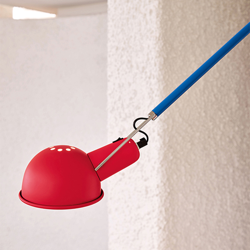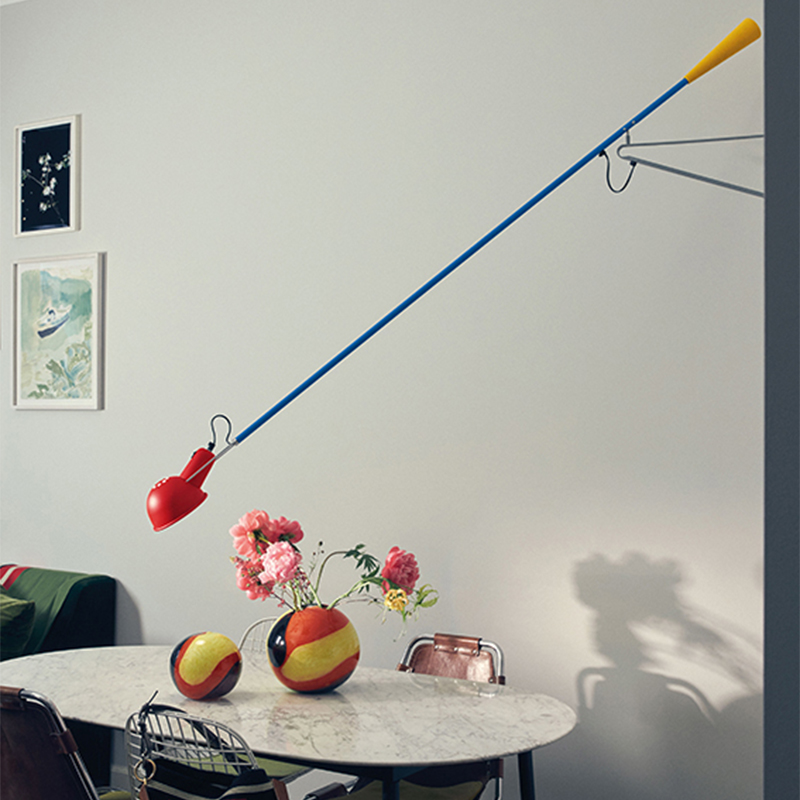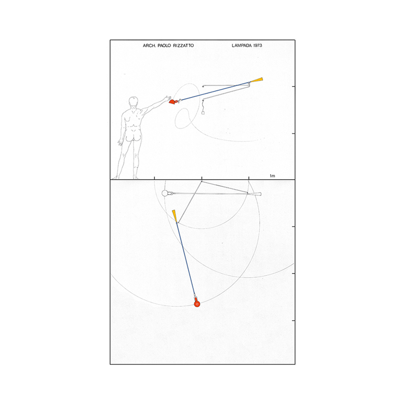265のデザインは、技術的に正確であると同時にシンプルで直感的な点が特徴です。ヘッドとウェイトを備えた吊り下げ式のウォールランプで、それぞれが調整可能なアームの先端でバランスをとり、非対称の位置でウォールに取り付けられています。ドローウィングでは、最も重要な要素であるヘッドは赤で描かれ、ウェイトは黄、連結アームは青でハイライトされており、「265 CHROMATICA」のデザインカラーにも反映されています。