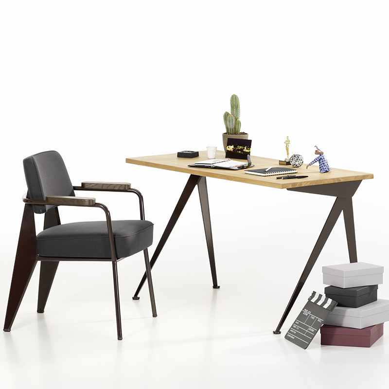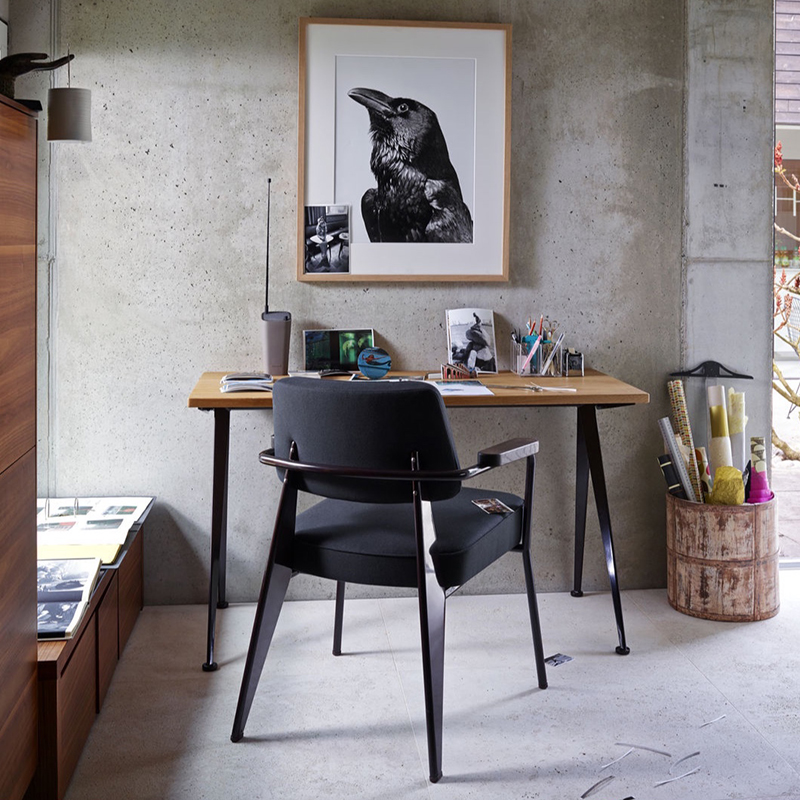 ジャン・プルーヴェによってデザインされた「コンパス ディレクション」は、シャープでエレガントに広がるスチール製の脚がコンパス(フランス語で‘le compas’ )の針を端的に表現しています。その合理的な構造は、デザイナーであり、エンジニアでもあるプルーヴェならではの特徴と言えます。オイル仕上げのソリッドウッドが用いられた天板と、スチール製の脚とのダイナミックなコントラストがホームオフィスの空間を魅力的に彩ります。