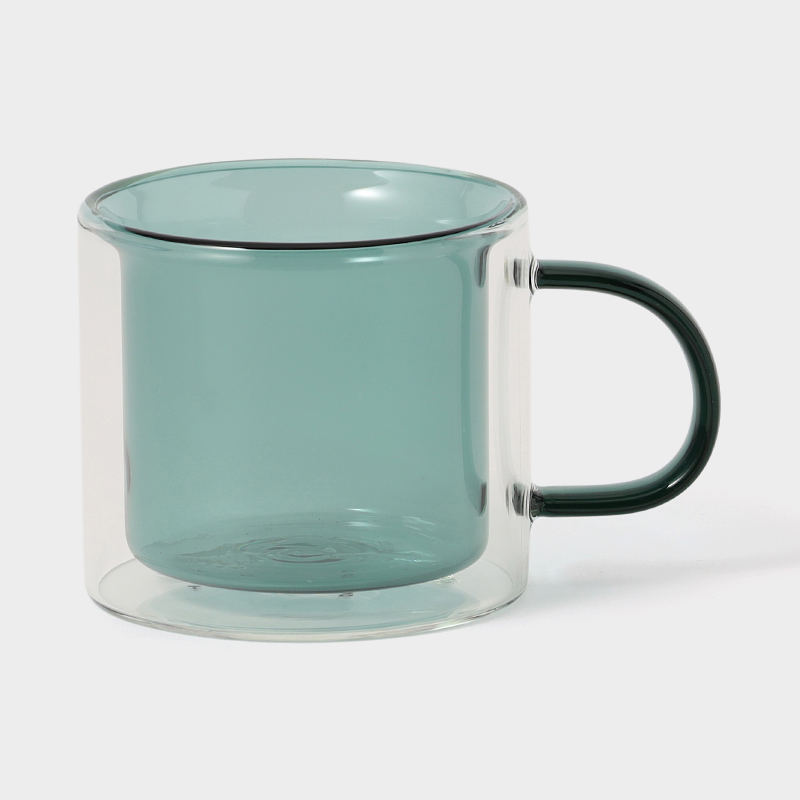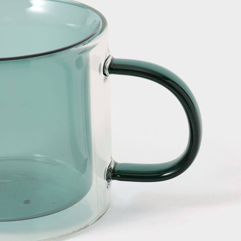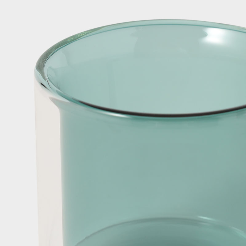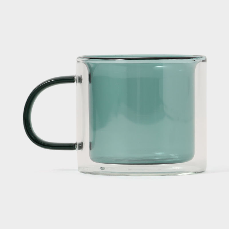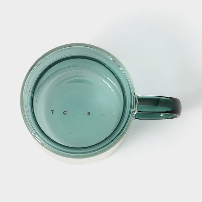 内側は色付ガラス、外側はクリアガラスでガラスの美しさが際立つユニークなデザインのマグカップです。