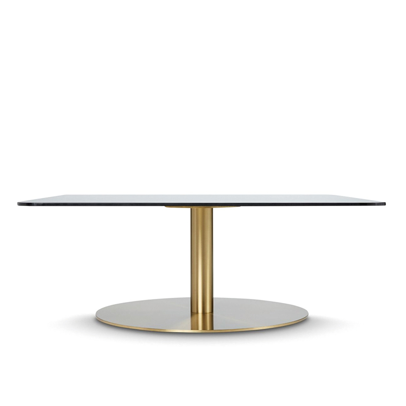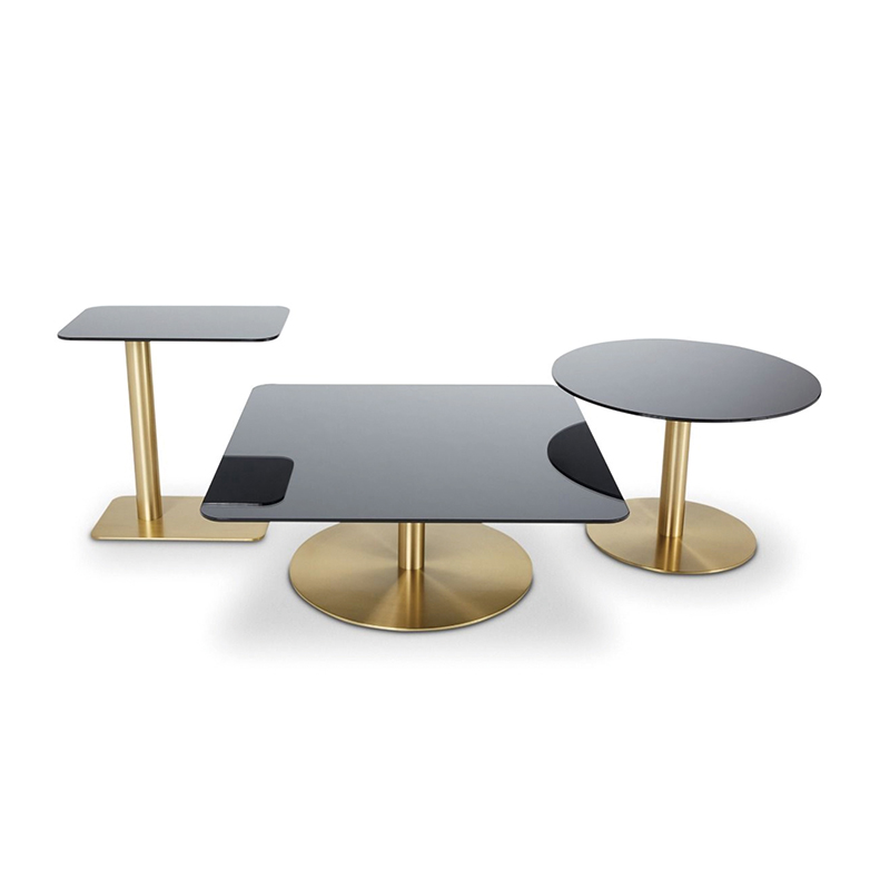 詳しい納期について事前確認をご希望の方は、下記の『商品について問い合わせる』よりお問い合わせください。ブラス(真鍮色)の脚と鏡面加工された3種類のガラスの天板があります。