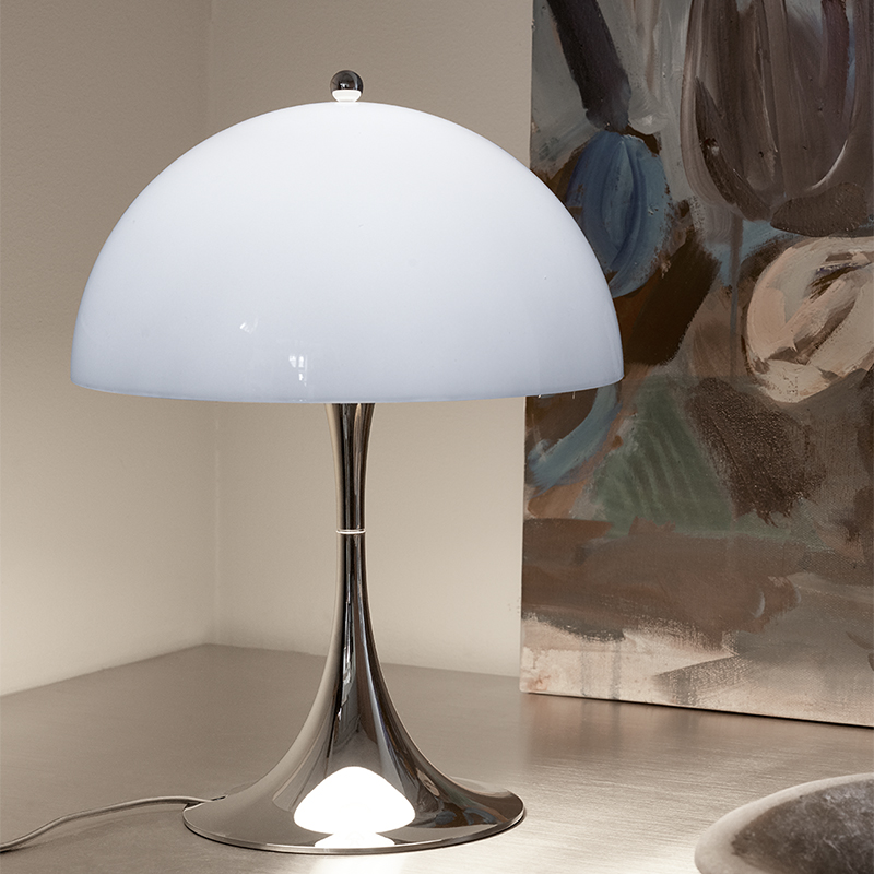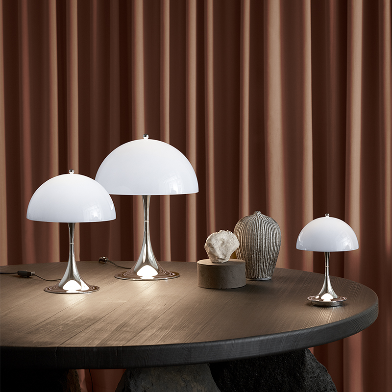 1971年にデンマークの建築家兼デザイナーのヴァーナー・パントンにより発表された「PANTHELLA」。当時、オリジナルのカラーバリエーションにあった「OPAL GREY」カラーが、2022年復刻されました。GREYカラーのシェードから拡がる下向きの光が、光沢のあるシルヴァー・クローム仕上げのベース部分に反射し、心地よい雰囲気を作り出します。また、点灯させるとシェードがGREYからOPAL(WHITE)に変り、色の変化をお楽しみいただけます。