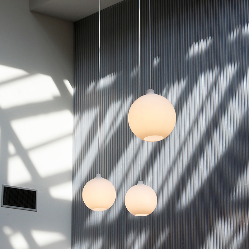 柔らかい光を拡散する三層吹きガラスのマットシェードは、明かりを消したときにも美しい表情を保ちます。