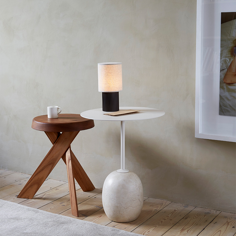 アルミニウムで作られたインダストリアルなデザインのベースと、キャンパス生地の柔らかな風合が美しいシェードのポータブルライト。
