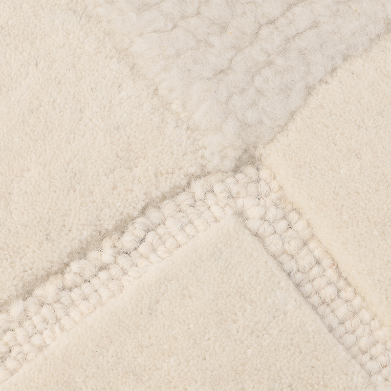 ベルベット、タフティング、ローパイルの技法を組み合せて作られた抽象的な幾何学デザインと柔らかな手触りが特徴です。