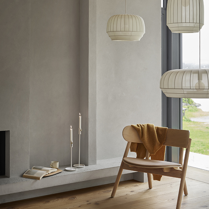 ベッド、ダイニングテーブル、ソファなどの側に単体で吊るし、心地よい空間をつくることも、3つ並べて吊るしてそのインパクトを最大化させることもできます。