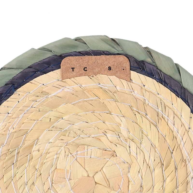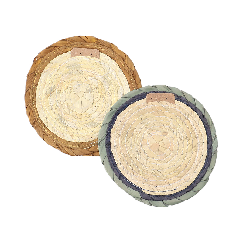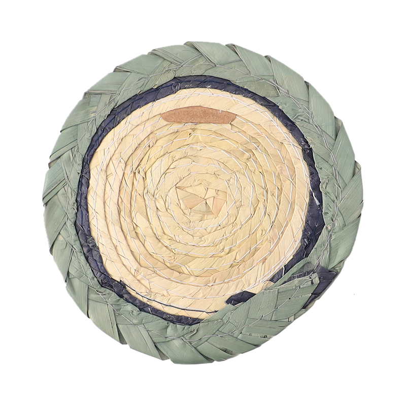 ヤシの木の葉を使用し、ハンドメイドで作られたコースターは、ベースのナチュラルカラーにアプリコット、ブルー、セージ、レンガ色など、大地や植物、海などの大自然を思わせるカラーを組み合わせて作られました。