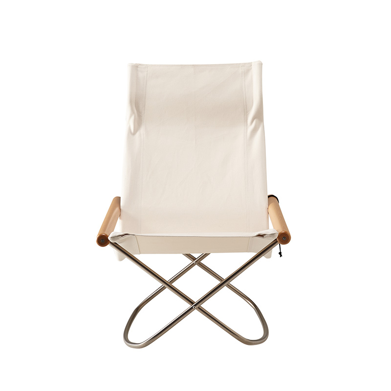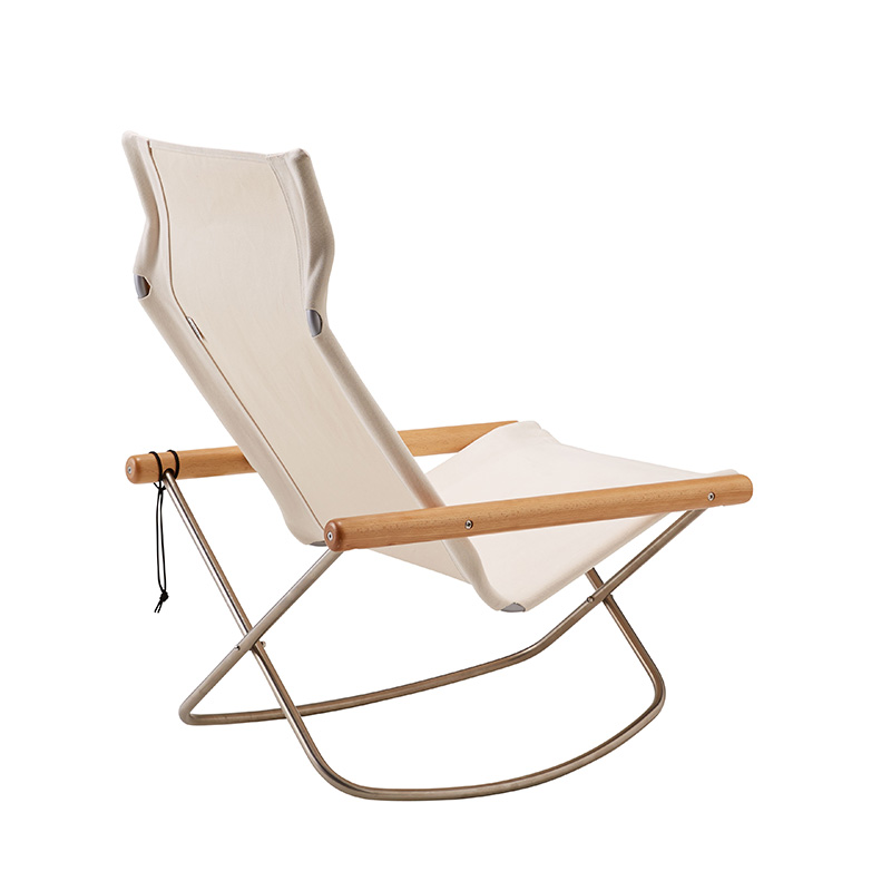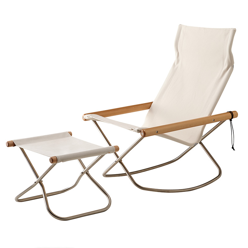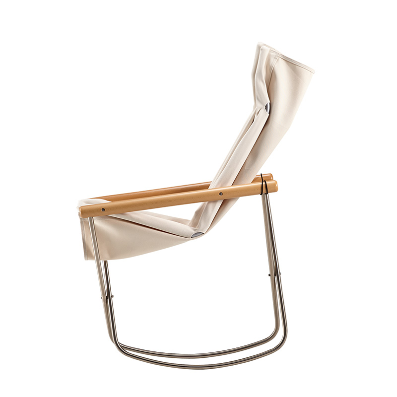 1970年、デザイナーの新居 猛(にい たけし)によって生み出された「ニーチェアエックス」。1950年代から折り畳み椅子づくりをはじめ、試行錯誤の末たどり着いたのが、脚部のX構造でした。さらに木製の肘かけ、シートには綿の厚織生地を採用。すべてが相まって、快適な座り心地を実現しています。その後に続く「ニーチェアエックスシリーズ」の原点であり、生涯折り畳み椅子の開発に取り組んだ新居の集大成といえる製品です。監修を務める島崎 信氏により新居の姓とデンマーク語で「新しい」を意味する「Ny(ニュイ)」をかけ合わせ、