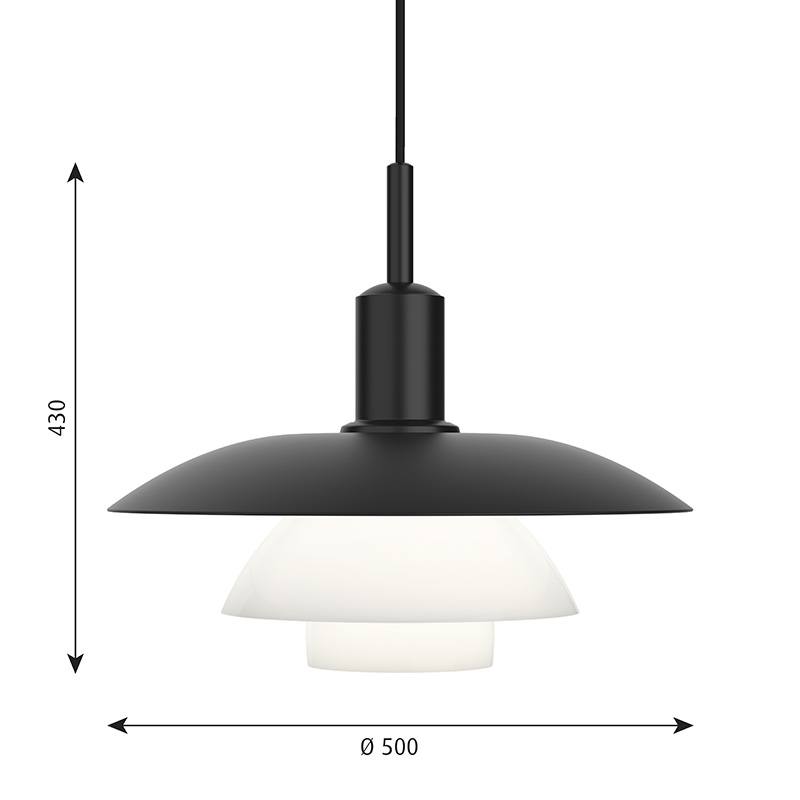 「ホールナンバー」タイプでは、3枚のシェードの直径比率は、3 : 2 : 1となります。「ホールナンバー」タイプは、通常のPHシリーズと比べ2枚目と3枚目のシェードの広がり角度が大きく、下方の広いエリアに光を反射するため、高く吊るすのにも適しています。(注:しかし、トップシェードが金属の場合は、上への光を遮るので、壁面の高い部分や天井面には光を届けません。家庭で高く吊る場合は、単独ではなく、上方への光を補う他のランプと組み合わせると、美しい光のバランスが得られます。)