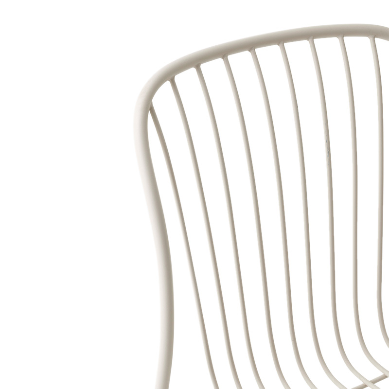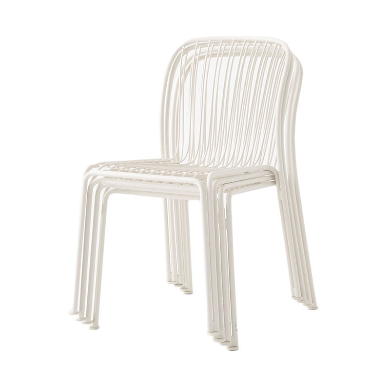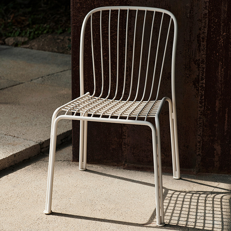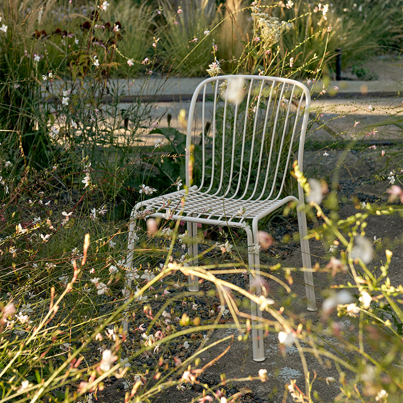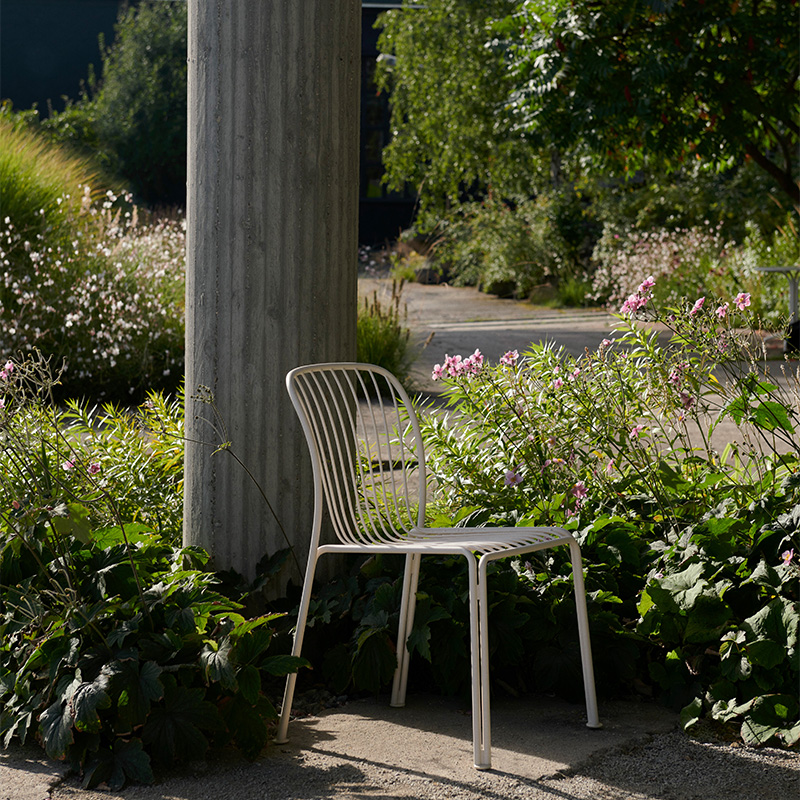 スタッキング可能なサイドチェアのスチールフレームと格子状の座面は、エレガントで用途の広いシリーズのシーンを演出しています。