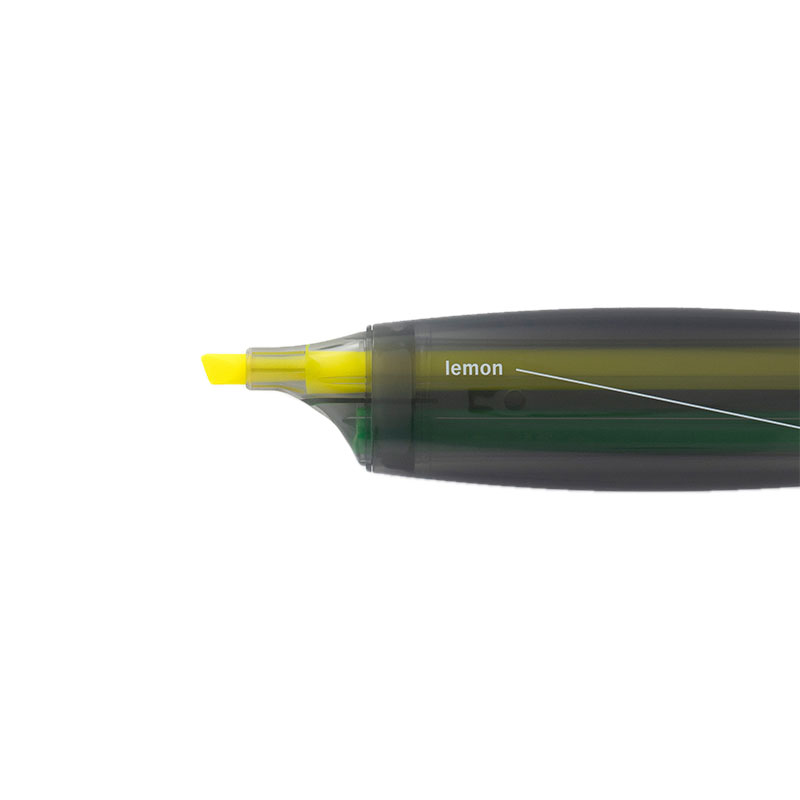 自分たちのレンズを通して本当に良いと思ったものを日本全国から探し出し、各地のメーカーと協業したアイテムを展開しています。2色のリフィルが平行して並ぶ、ユニークな形の蛍光ペン。