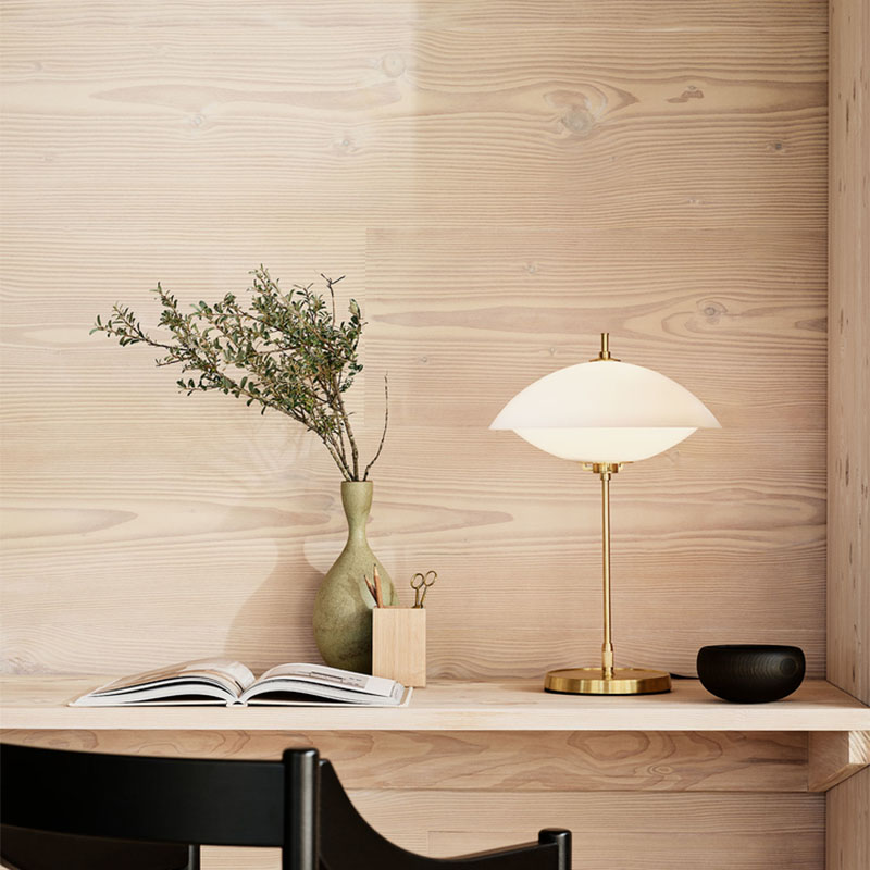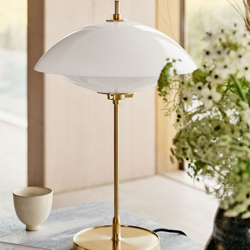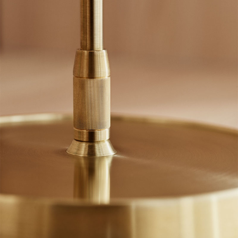 テーブルランプの脚には、独特な質感が魅力の真鍮製の照明スイッチが付属。ホームオフィスに置いて読書灯として、あるいは生活空間に彩りを添える彫刻的なオブジェとしてもお楽しみいただけます。