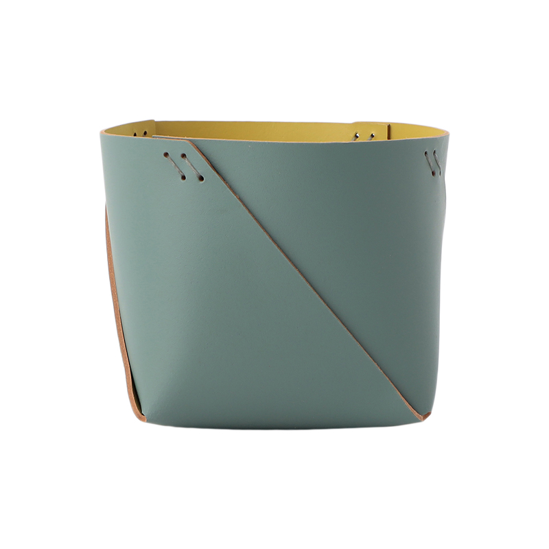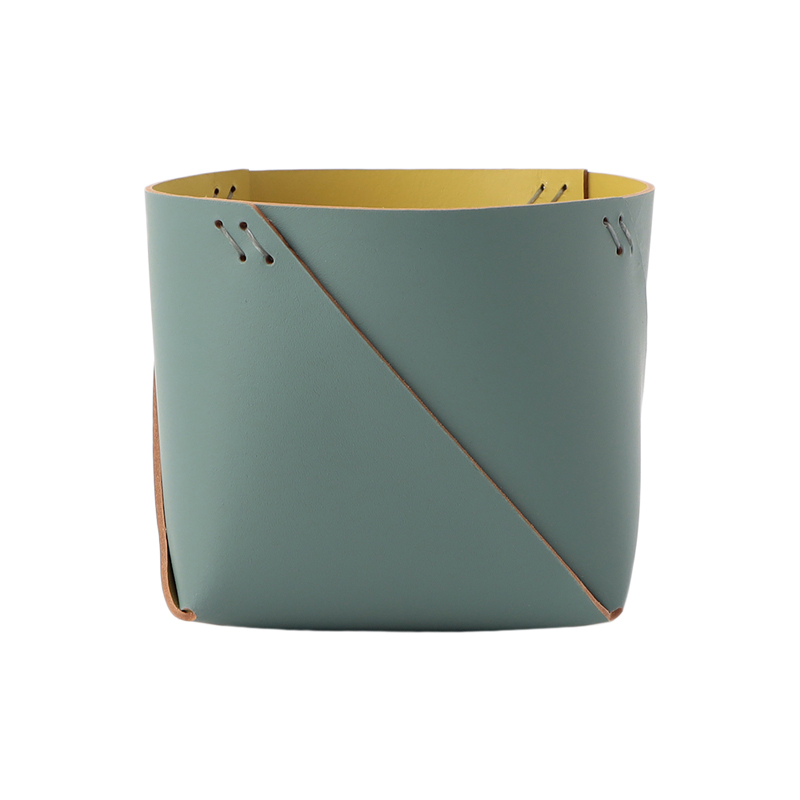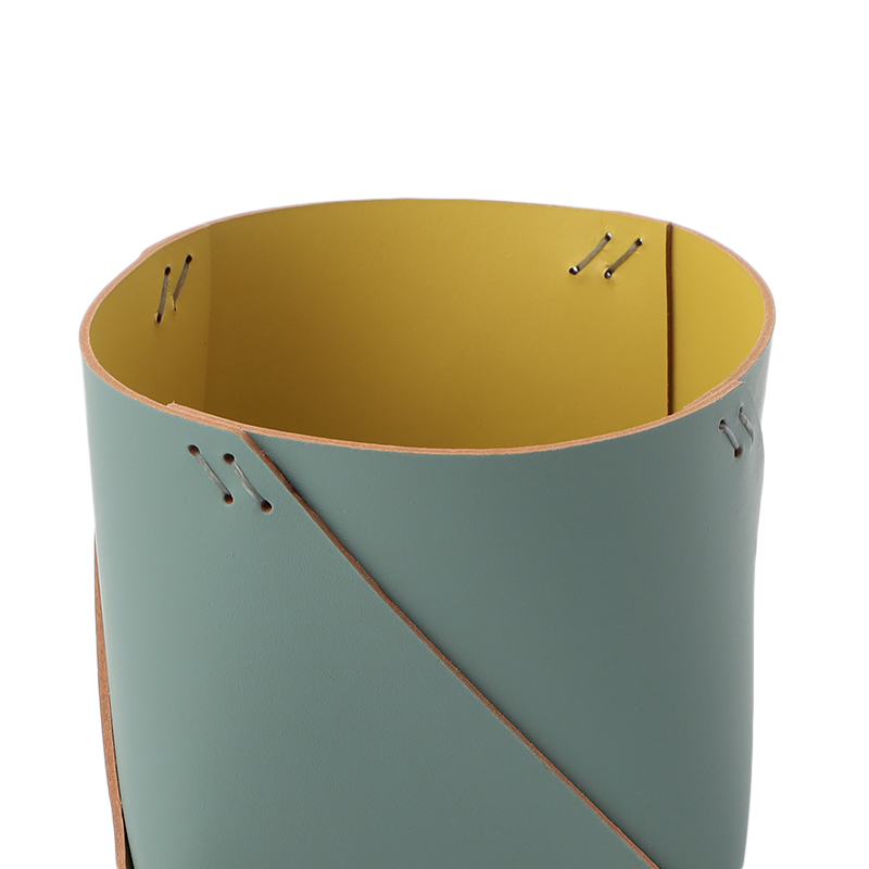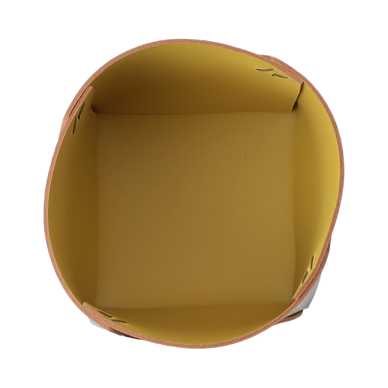 シックなユーカリ色の外側と柔らかいマスタード色の内側のツートーンカラーが、ワークスペースに遊び心をプラスします。