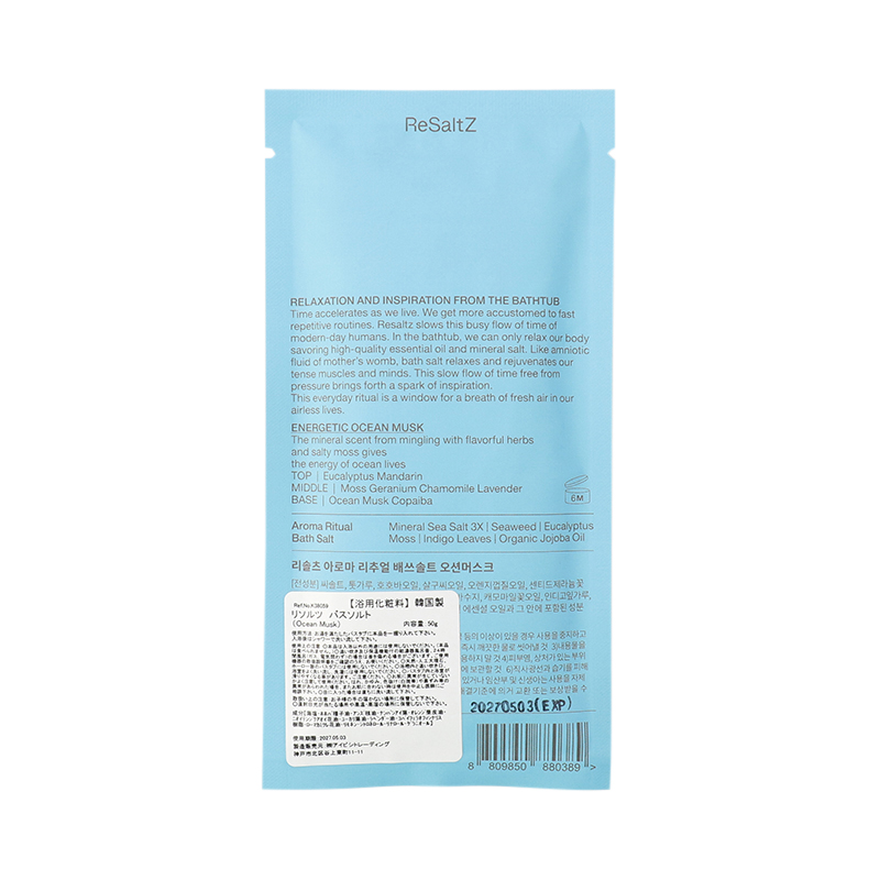 ReSaltZとは、Re(回復)、Salt(生命の礎)、Z(未知数)を意味する言葉で、体にやさしい自然素材を通じて、体本来の回復を表現し、バランスの取れた生活と健康的な美を支えるプロダクトを提案しています。ミネラル成分が豊富な韓国・全羅南道の飛禽島(ピグムド)の天日塩をベースに、天然アロマオイル、肌の保湿力を高める栄養成分を多く含んだエッセンシャルオイル、お肌に優しいハーブが豊富に含まれたウェルネスバスソルト。