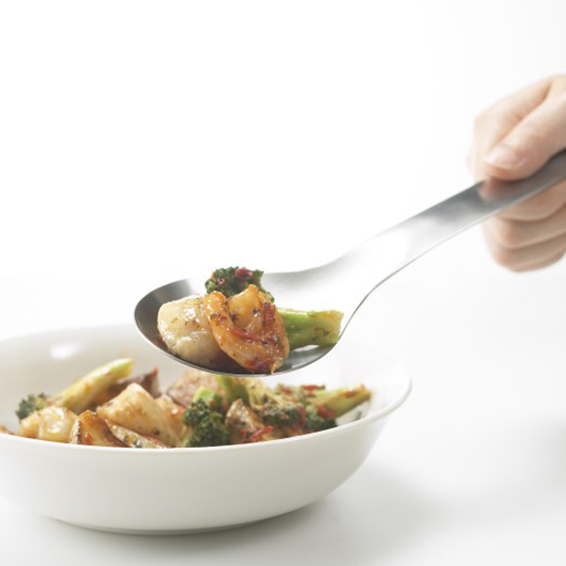 先端の丸みと深すぎない曲面で、食器や鍋のふちに沿って最後まできれいにとることができるサービングスプーン。