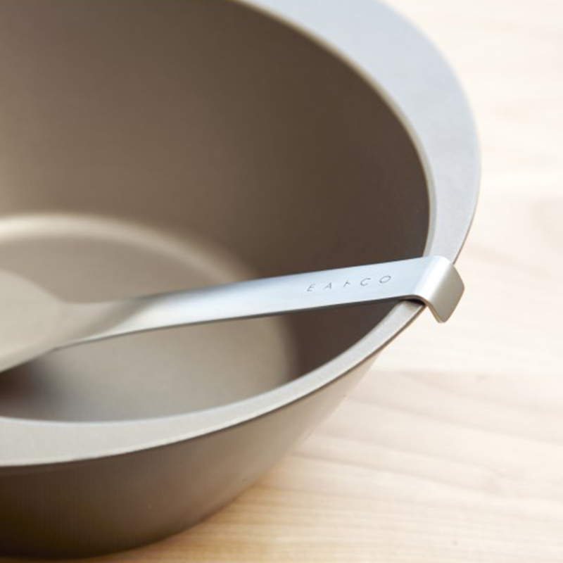EAトCOはそんな想いから生まれた、新潟県燕三条のブランドです。先端の丸みと深すぎない曲面で、食器や鍋のふちに沿って最後まできれいにとることができるサービングスプーン。