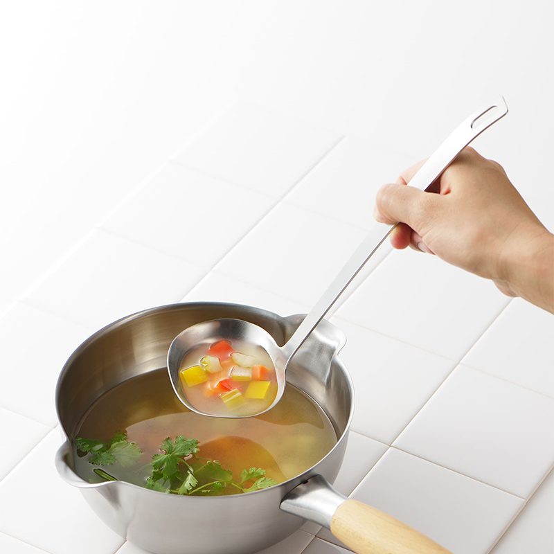 日々の暮らしをより豊かなものにするための台所道具として立ち上げられたブランド。燕三条(新潟県)の地場の技術を駆使した商品となっています。鍋底にぴったりフィットする形状で、具材をくまなく混ぜられるだけでなく、鍋底やヘリに残った汁や具も余さずすくい取れます。手になじむ使いやすいハンドルカーブと、つぎ目のない一体成形デザインで、汚れがたまりにくく、お手入れが簡単なのも魅力です。