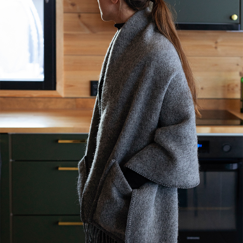 ポケットショールは日々の生活に溶け込む手軽さと、羽織るだけでスタイルアップしてくれるファッション性が魅力です。