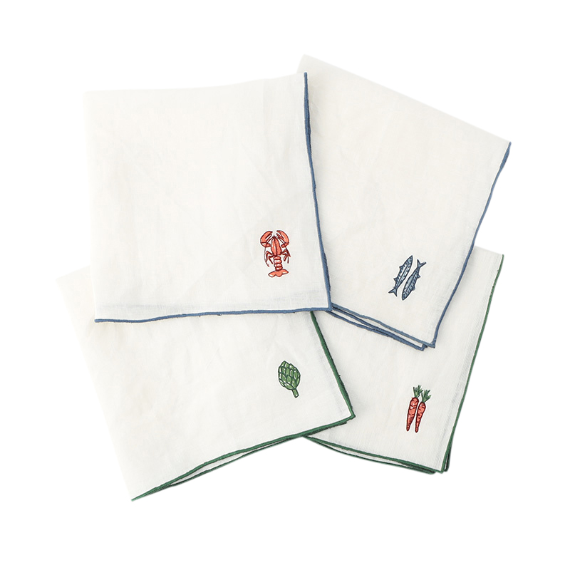 アーティチョークのモチーフが刺繍されたリネン100%のナプキンは、柔らかさと耐久性を兼ね備えており、カジュアルな食事にもおもてなしのディナーにもぴったりです。
